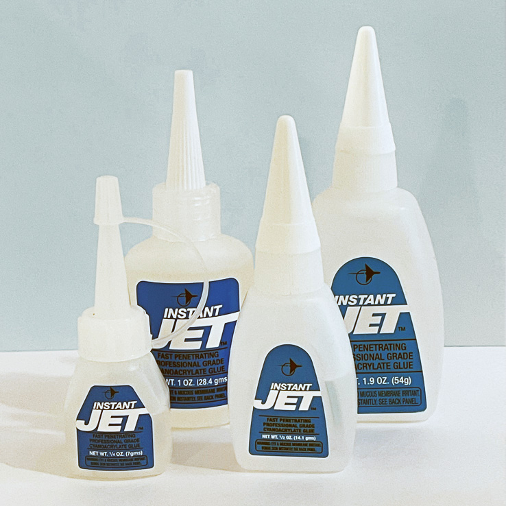 INSTANT JETTM sets fastest, usually in 10-20 seconds. Its watery consistency allows it to “wick” into porous material to provide extra reinforcement in the substrate material. It also forms an excellent, corrosive-resistant finish, and is useful both for “tack” gluing and various final bonds.